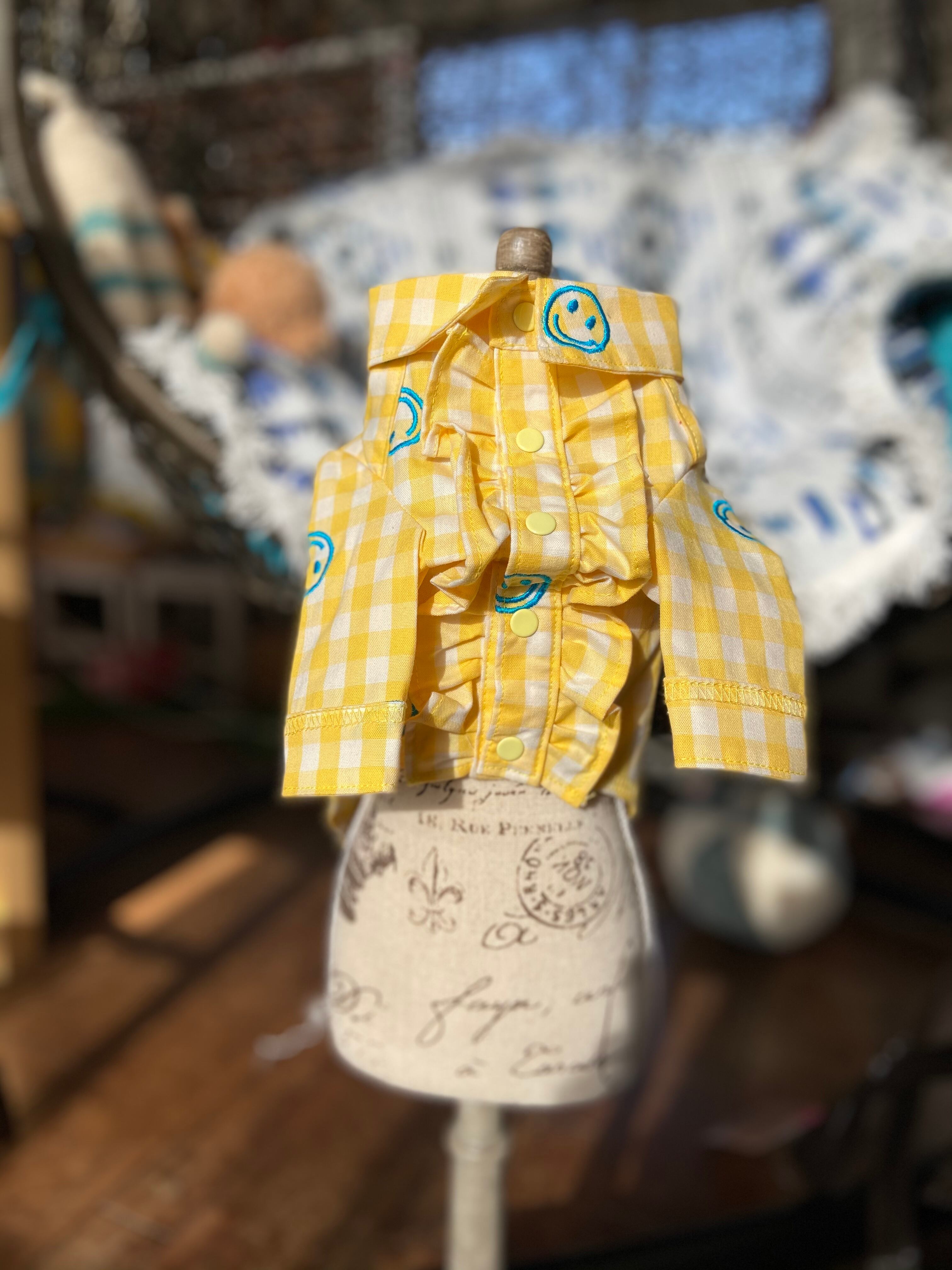 ミモザ色のギンガムチェックにスマイリーの刺繍。生地は韓国から仕入れて作ったハンドメイドです。